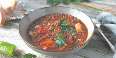 Šargarepu, celer i beli luk oprati, očistiti i iseckati, pa preliti maslinovim uljem, posoliti i pomešati. Staviti u tepsiju i peći u rerni na 200 stepeni oko 15 minuta. Crni luk sitno iseckati, pa propržiti u dubljoj šerpi. Dodati pečeno povrće, sočivo i krompir isečen na kockice, naliti supom i kuvati na umerenoj temperaturi oko pola sata. Posoliti, pobiberiti i začiniti po ukusu. Umešati senf i sok od limuna, te kuvati još 15 minuta.