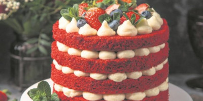 Pomešati brašno, kakao, prašak za pecivo i prstohvat soli. U drugoj činiji mikserom umutiti maslac, dodati ulje, žumanca i mleko, sve dobro izmiksati, pa dodati i belanca prethodno ulupana u čvrst šam. Dodati smesu od brašna i sjediniti. Na kraju umešati crvenu boju za kolače, podeliti na četiri dela, pa peći četiri kore na 180 stepeni oko pola sata. U međuvremenu izmiksati krem-sir, maslac, šećer, vanilu i slatku pavlaku. Filovati kore, složiti tortu, pa ukrasiti voćem po izboru.