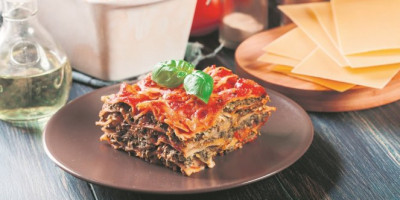 U vatrostalnu činiju staviti malo smese od mesa, odozgo poslagati kore, pa preliti bešamel sosom. Prekriti korama, premazati preostalim filom od mesa, te završiti korama. Odozgo rasporediti preostali bešamel. Peći u rerni na 180 stepeni oko 45 minuta, posuti parmezanom, pa peći još 10 minuta.