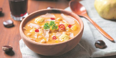 U šerpi na maslinovom ulju propržiti iseckan crni i beli luk, pa naliti supom, ubaciti leblebije i na komade isečen krompir, te kuvati 45 minuta, da sve lepo omekša. Dodati lovor, kesten, so i biber, te kuvati još 15 minuta. Poslužiti dok je toplo.