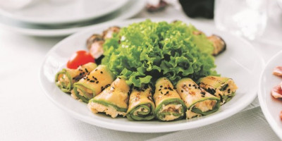 Tikvice dobro oprati, pa pilerom iseći na tanke trake. Posoliti, ostaviti da odstoje 15 minuta, pa ocediti, isprati i prosušiti. Premazati sa malo ulja i kratko izgrilovati na gril tiganju. U međuvremenu pomešati krem-sir, kiselu pavlaku, rendanu koru limuna, grubo usitnjene orahe, so i biber. Premazati tikvice dobijenom smesom, urolati, poređati na tanjir za serviranje, začiniti, posuti susamom i poslužiti.