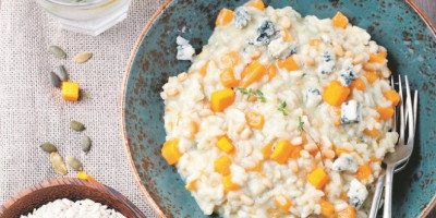 Bundevu isečenu na kockice preliti uljem, staviti u pleh, pa peći u rerni na 200 stepeni oko 25 minuta. U većem tiganju zagrejati malo ulja, pa propržiti iseckan crni luk. Dodati beli luk, mešati minut, pa ubaciti pirinač i pržiti uz mešanje još dva minuta. Preliti vinom, mešati dok ne ispari alkohol, te naliti sa malo supe i mešati dok tečnost ne ispari. Dodati bundevu, naliti sa još supe, mešati dok ne ispari, pa ponavljati postupak dok se pirinač ne skuva. Umešati gorgonzolu, parmezan i majčinu dušicu, posuti semenkama bundeve, začiniti i poslužiti dok je toplo.