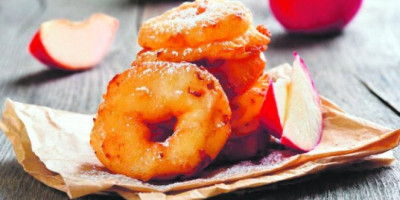 Krugove od jabuka umočite u testo, pa pržite na ulju sa obe strane dok ne porumene. Vadite na papir da upije višak ulja. Pospite šećerom u prahu i služite.