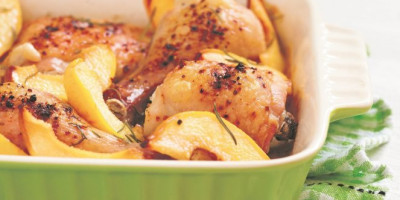 Meso prelijte maslinovim uljem, posolite, pobiberite, pospite seckanim bosiljkom i položite u pleh, obložen papirom za pečenje. Preko poređajte dunje isečene na kolutiće, poprskajte maslinovim uljem i pecite 25 minuta na 180 stepeni. Za to vreme zagrejte puter, dodajte brašno i toplo mleko i mešajte da se ne stvaraju grudvice. Posolite, dodajte malo muskatnog oraščića i pobiberite. Kad se sos zgusne, skinite s ringle, dodajte kiselu pavlaku i promešajte. Sos sipajte preko mesa i dunja i pecite još dva-tri minuta.