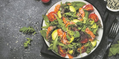 Zelenu salatu oprati, prosušiti, iscepkati i staviti u adekvatnu činiju. Dodati rukolu, iseckan avokado, prepolovljen čeri i tanko sečeni dimljeni losos. Preliti maslinovim uljem i sveže ceđenim sokom od limuna, posoliti i pobiberiti, posuti crnim i belim susamom, promešati i odmah poslužiti.