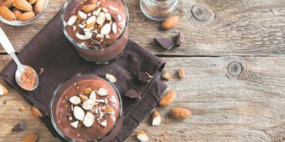 Čokoladu istopite na pari, pomešajte sve sastojke u posudi ili blenderu i ispasirajte da dobijete ujednačeni čokoladni mus. Rasporedite u čaše i pospite seckanim bademima.