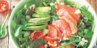 Kinou dobro isprati, staviti u činiju, naliti vodom da ogrezne, pa ostaviti da odstoji desetak minuta. Potom ocediti, prebaciti u šerpu, naliti sa tri šolje vode, posoliti i kuvati na jakoj vatri dok ne počne da ključa. Smanjiti vatru, poklopiti i lagano krčkati još 15 minuta, da kinoa upije svu tečnost. U međuvremenu očistiti i iseckati krastavac, paradajz i avokado, te staviti u adekvatnu činiju za salatu. Dodati oceđenu i prohlađenu kinou, tanko sečen dimljeni losos, so, biber, peršun, ulje i sok od limuna, promešati i poslužiti.