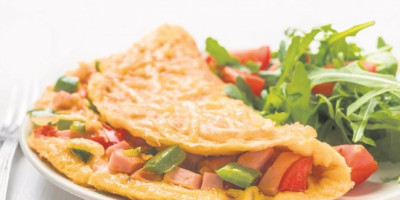 Promešati, preliti prethodno umućenim jajima, te peći dva-tri minuta, da se uhvati korica. Pažljivo okrenuti, posoliti, pobiberiti, začiniti iseckanim vlašcem, peći još minut i poslužiti.