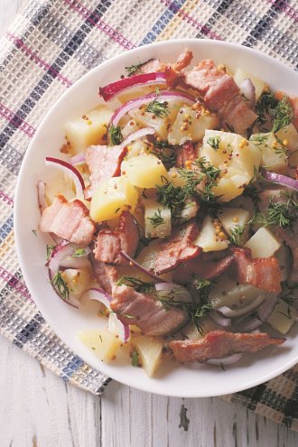 Krompir dobro oprati, pa kuvati u ljusci u slanoj, ključaloj vodi, oko 15 minuta. Potom ga ocediti, prohladiti, oguliti i iseći na komade. Staviti u podmazanu vatrostalnu činiju, pa dodati cele čenove belog luka i na rebarca isečen crveni luk. Posoliti, pobiberiti, začiniti ruzmarinom i mlevenom paprikom, te dodati i iseckanu pancetu. Sve dobro promešati, pa peći u rerni na 200 stepeni 20 minuta, da krompir porumeni i panceta postane hrskava. Poslužiti dok je toplo.
