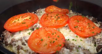 Posolite i pobiberite, pa sipajte meso u tiganj preko krompira, pa pospite rendanim sirom i paradajzom isečenim na kolutove.