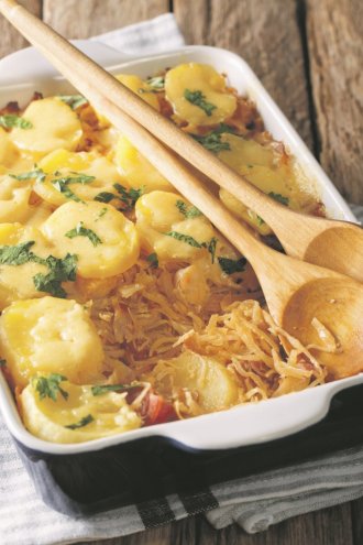 Slaninu iseći na kockice i kratko propržiti u tiganju na malo zagrejanog ulja. Dodati kupus i mešati dok ne omekša. Krompir oguliti i iseći na kolutove, pa polovinu staviti u podmazanu vatrostalnu činiju. Odozgo rasporediti kupus, te ga prekriti preostalim krompirom. Preliti sa malo ulja i peći u rerni na 220 stepeni 35-40 minuta. Preko krompira potom rasporediti izrendanu gaudu, začiniti peršunom, te vratiti u rernu i peći još 20 minuta.