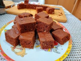 Umutiti jaja sa šećerom, dodati brašno sa praskom za pecivom, maslac otopljenog ,otopljenu čokoladu i izmešati.