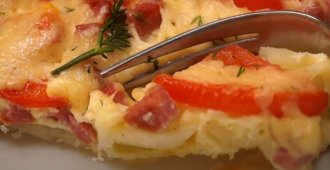 Posolite i pobiberite. Izvadite krompir iz rerne, preko prelijte smesu sa jajima i onda poređajte šunku i paradajz.