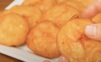 Promešajte jogurt, mleko, jaje, beli šećer. Prosejati brašno, kašičicu praška za pecivo i četvrtinu kašičice sode bikarbone. Dodati prstohvat soli i dobro promešati. Ulje zagrejati, pa smesu izdvajati u njega i pržiti na srednjoj toploti. Okrenite svaki komad i nastavite da pržite, dok obe strane ne postanu zlatno braon boje.