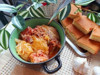 Dodati u ekspres lonac ili šerpu jednu glavicu seckanog kupusa, pa u sredinu poređati suhomesnato, lovor, pa odozgo naseckajte drugu glavicu.