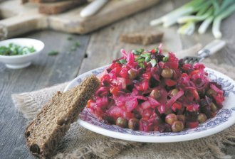 Krompir i cveklu skuvati odvojeno u ljusci, prohladiti, oguliti, sitno iseckati i staviti u činiju. Dodati kiseli kupus, rendane šargarepe i jabuke, oceđeni grašak, kisele krastavčiće, na rebarca isečen crveni luk, so, biber i maslinovo ulje, te sve dobro promešati. Staviti u frižider da odstoji sat-dva, pa poslužiti.
