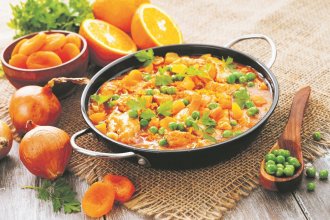 Luk iseckajte, meso odvojte od kostiju i svako parče podelite na dva dela. U šerpi prodinstajte luk i meso, dodajte šargarepu isečenu na kolutove i grašak, a potom i krompir isečen na krupnije kockice. Sipajte paradajz pire i vodu, da povrće i meso ogreznu. Stavite so i mešavinu začina po ukusu, pa kuvajte oko 45 minuta ili dok meso i povrće ne budu mekani. Na kraju pobiberite po ukusu i pospite sitno seckanim peršunom. Napomena: za egzotičniji ukus dodajte sok od pomorandže umesto vode i par seckanih suvih kajsija zajedno sa povrćem.