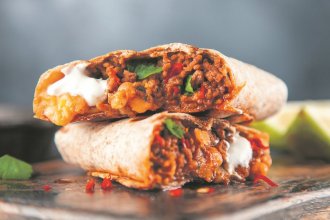 Propržite luk, dodajte meso, ljuti začin i so i dinstajte dolivajući vodu 15-20 minuta. Dodajte paradajz iz konzerve, papriku iseckanu na kockice i nastavite da dinstate još 15 minuta. Pred kraj dodajte crveni pasulj, kuvani kukuruz šećerac, preostali suvi začin i malo peršuna. Tortilje blago zagrejte s obe strane u tiganju bez ulja, na svaku stavite po 2 kašike nadeva, zarolajte i poslužite.