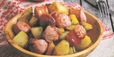 Krompir potom izvaditi iz rerne, te odozgo rasporediti domaću kobasicu isečenu na komade veličine zalogaja. Peći još sedam-osam minuta, da kobasice dobiju lepu boju, pa poslužiti dok je toplo.