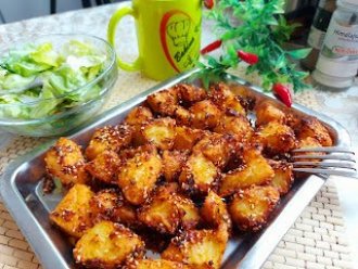 Krompir očistiti i iseći na kocke pa kuvati 10-15 minuta. Ocediti i i isprati u hladnoj vodi. Na foliju staviti rendan kačkavalj, ruzmarin dodati susam, kurkumu papriku jednu i drugu, mleveni biber i beli luk.