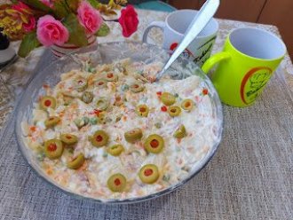 Povrće skuvati pa i njega ohladiti. U testeninu dodati ohlađeno povrće, jaja, majonez, kiselu pavlaku, seckanu šunku seckane maslinke i posoliti.