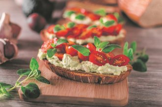 Sjediniti omekšali krem-sir, kiselu pavlaku, sitno seckan vlašac, mirođiju, beli luk, so i biber. Hleb kratko prepeći u tosteru ili u rerni, da lepo porumeni, pa ga premazati pripremljenom smesom. Odozgo rasporediti prepolovljen čeri paradajz, ukrasiti svežim bosiljkom i poslužiti.