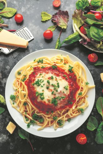 Piletinu istanjiti tučkom za meso, pa uvaljati najpre u brašno pomešano sa malo soli i bibera, potom u jaja umućena sa mlekom i na kraju u mešavinu prezli i parmezana. Meso peći u tiganju na zagrejanom ulju dok ne porumeni sa obe strane. U vatrostalnu činiju sipati malo sosa od paradajza, odozgo poređati meso, preliti ostatkom sosa, pa preko toga rasporediti mocarelu. Posuti peršunom i peći u rerni na 180 stepeni 30 minuta. Poslužiti dok je toplo, uz špagete ili neki drugi prilog po želji.