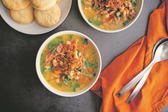 Slaninu isečenu na listove propržiti. Veći deo izvaditi sa strane i sačuvati za kraj. Komorač isečen na listove dodati u šerpu sa preostalom slaninom. Dodati ulje i propržiti zajedno sa slaninom. Začiniti solju, biberom, čilijem, kratko pržiti pa dodati belo vino i majčinu dušicu. Kad alkohol ispari, dodati pasulj, bujon, isečen pelat i kuvati 10 do 15 minuta. Na kraju dodati kelj isečen na trake, poklopiti šerpu i kuvati još 10 minuta. Jelo servirati i ukrasiti proprženom slaninom.