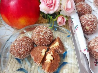 Posebno izmešati mlevene orahe, kokos i rendanu čokoladu, po želji dodati prah šećer.Od mase sa keksom praviti kuglice i valjati u izmešane orahe, kokos i čokoladu.