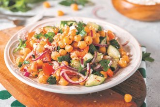 Leblebije ocediti i staviti u adekvatnu činiju. Dodati na rebarca isečen crveni luk, iseckan krastavac i peršun, posoliti i pobiberiti, preliti sa malo ulja i sveže ceđenog soka od limuna, te sve dobro sjediniti. Potom dodati susam i izmrvljenu fetu, još jednom promešati i odmah poslužiti.