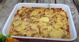 U krompir dodajte parmezan, seckanu šunku, proprženi luk, pavlaku za kuvanje, brašno i dobro promešajte. Tepsiju nauljite i pospite prezlama.