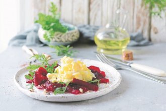 Cveklu oprati, staviti u šerpu, naliti vodom i kuvati na umerenoj vatri dok ne omekša. Prohladiti, oguliti, iseći na kolutove i staviti na tanjir za serviranje. Preliti maslinovim uljem i balzamikom, posoliti i pobiberiti, te posuti iseckanim orasima i rukolom. Jaja umutiti sa malo mleka, ispržiti u tiganju kajganu, rasporediti preko cvekle, začiniti po ukusu i odmah poslužiti.