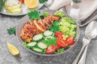 Pileći file posoliti i pobiberiti, premazati senfom, ostaviti da odstoji desetak minuta, pa ga propržiti u tiganju na malo zagrejanog ulja, da dobije lepu boju. Potom ga peći u rerni na 200 stepeni 15-20 minuta. U adekvatnu činiju staviti rukolu, iscepkane listove zelene salate, prepolovljen čeri, na kolutove isečen krastavac i na kockice isečen celer, dodati meso, posoliti, pobiberiti, začiniti peršunom i preliti uljem i sokom od limuna, te odmah poslužiti.