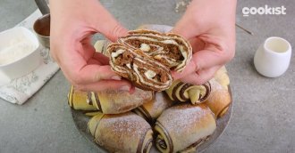 Testo podelite na pola. Polovinu testa poravnati rukama i sipati kakao prah. Mesite testo dok se kakao dobro ne upije i dok testo ne postane glatko. Oba testa prebacite u pleh obložen papirom za pečenje, prekrijte krpom i ostavite da se diže 2 sata.