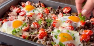 Napravite rupu u sredini i sipajte paradajz pastu i senf, pa promešajte. Sipajte preko krompira. Preko poređajte čeri paradajz isečen na pola, kao i seckani peršun, a onda razbijte četiri jajeta. Rasporedite ih tako da imaju razmak.