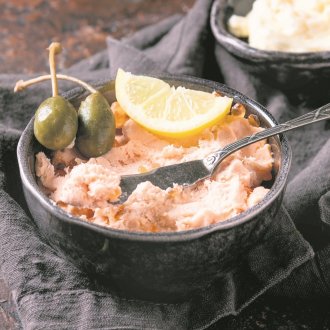 Filete lososa obariti u ključaloj vodi, pa prohladiti i odstraniti kožu i koščice. Iseći na komade i staviti u blender. Dodati krem-sir, sveže ceđeni sok od limuna, mirođiju, so i biber. Miksati dok se ne dobije ujednačena smesa.