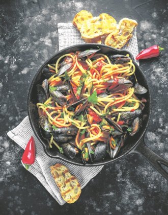 Špagete skuvati u ključaloj vodi, prema upustvu sa pakovanja. Iseckan crni luk, dva cela čena belog luka i vino kuvati u loncu dok ne počne da ključa, pa ubaciti dagnje, poklopiti i kuvati pet-šest minuta, odnosno dok se školjke ne otvore. Skloniti sa ringle i prohladiti. U međuvremenu u većem tiganju kratko propržiti preostali čen belog luka i iseckane čili papričice, pa dodati usitnjeni paradajz pelat, so, biber i majčinu dušicu. Dodati dagnje i oceđene špagete, krčkati još nekoliko minuta, pa odmah poslužiti.