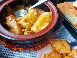 Dodati opran pirinač i na kockice celer i krompir. Ubaciti sve začine, promešati i zavijati sarme. Ređati u zemljan lonac, pa dodati lovorov list i još malo tucane ljute paprike i ulja.