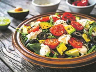 Zelenu salatu oprati, prosušiti, iscepkati i staviti u adekvatnu činiju. Dodati prepolovljen čeri, iscepkanu mocarelu, na kockice isečen avokado, na listiće isečene maslinke, so, biber i origano. Preliti maslinovim uljem i sveže ceđenim sokom od limuna, promešati i odmah poslužiti.