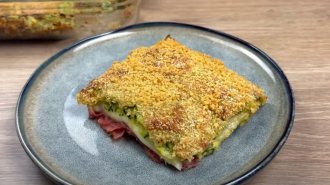 Preko poređajte šunku i sečen sir, pa još jedan sloj smese i poravnajte. Pospite prezlama, malo nauljite i pecite na 200 oko 40 minuta.