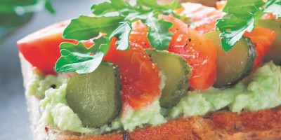 Hleb preliti uljem i kratko zapeći u rerni. U međuvremenu očistiti i zgnječiti avokado, pa ga sjediniti sa sirom. Posoliti i pobiberiti, premazati hleb, odozgo rasporediti iseckane krastavčiće, čeri i dimljenog lososa, ukrasiti sa malo rukole i odmah poslužiti.
