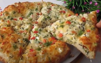 Pomešajte rednani sir, seckanu fetu, paprike, susam i mirođiju. Lepo promešajte sastojke, pa podelite na 2 jednaka dela. Zatim od jednog oblikujte loptu. Izvadite testo, malo da premesite i rukama oblikute krug. Stavite loptu od nadeva na testo, pa podginite krajeve ka sredini i lepo pokrijte ceo nadev. Razvucite testo oklagijom i premažite umućenim žumancetom.