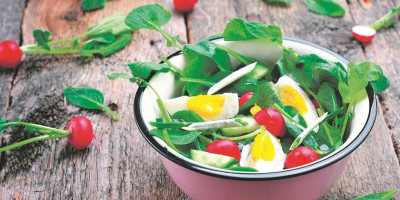 Jaja tvrdo skuvati, pa prohladiti, oljuštiti, iseći na četvrtine i staviti u činiju. Dodati opran i prosušen spanać, iseckan mladi luk, na kolutove isečen krastavac, rotkvice, ljutu papričicu, so i biber. Preliti maslinovim uljem, promešati i poslužiti.