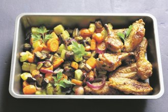 Zagrejte rernu na 200 stepeni. U velikoj činiji pomešajte šargarepu, tikvice, karfiol, celer i beli luk. Posolite i pobiberite po ukusu. Krilca posolite i pobiberite sa obe strane, pa ih stavite na pleh obložen papirom za pečenje. Povrće rasporedite oko krilaca. Pomešajte limunov sok i maslinovo ulje, pa prelijte krilca i povrće. Pecite u rerni oko 40-50 minuta, dok se piletina potpuno ne ispeče.