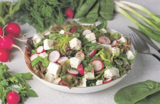 Spanać i rotkvice operite, isecite na manje komade i stavite u činiju. Dodajte izmrvljeni feta-sir. U manjoj činiji pomešajte maslinovo ulje, balzamiko, so i biber. Prelijte preko salate i sve dobro izmešajte, pa dodajte malo mirođije.
