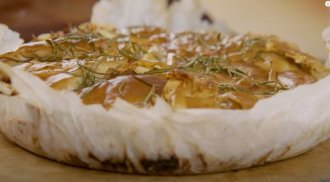 Zatvorite korama koje vire iz tiganja (bez pek papira, njega isecite). Ostavite na šporetu 2 minuta na jakoj vatri da uhvati koricu, pa stavite gibanicu u zagrejanu rernu na 200 oko 20 minuta.