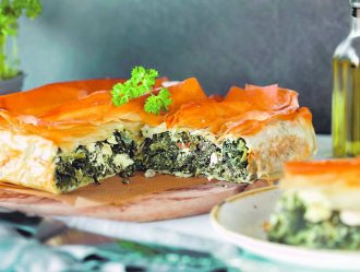 Preko fila poređajte tri kore, a svaku poprskajte uljem, pa opet nafilujte i tako dok ne utrošite materijal. Na kraju "zatvorite" pitu krajevima kora koje vise preko ivica pleha. Pecite oko 40 minuta na 200 stepeni.