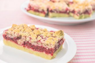 Spojiti suve sastojke: brašno, šećer, so, griz i prašak za pecivo. Smesu podeliti na tri dela. Odleđene višnje ne cediti, već im dodati šećer sa vanilin-šećerom, cimet i ulje i mešajući dobro sjediniti. Pleh za pečenje veličine 30 x 20 cm podmazati uljem ili komadićem margarina, pa sipati deo suvih sastojaka. Kašikom rasporediti po celoj površini i preliti polovinom fila od višanja. Preko njih staviti drugi sloj suvih sastojaka, pa ostatak višanja i završiti trećim delom smese sa brašnom. Odozgo narendati malo margarina i po želji preliti sa pola čaše soka od višanja. Peći u rerni zagrejanoj na 180 stepeni pola sata do 45 minuta.