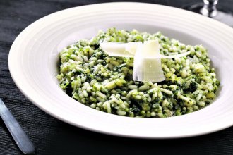Operite spanać i iskidajte, a luk isecite na sitno i prodinstajte na ulju. Postepeno, po šaku, ubacujte spanać, a kad tečnost ispari, dodajte i pirinač.