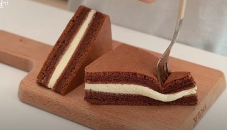 Kada se ohladi isecite na pola, da dobijete dva pravougaonika. Umutite slatku pavlaku sa šećerom i premažite preko jedne kore, pa preklopite drugom. Umotajte kolač u providnu foliju i kratko ohladite u frižideru. Isecite trouglove i služite.
